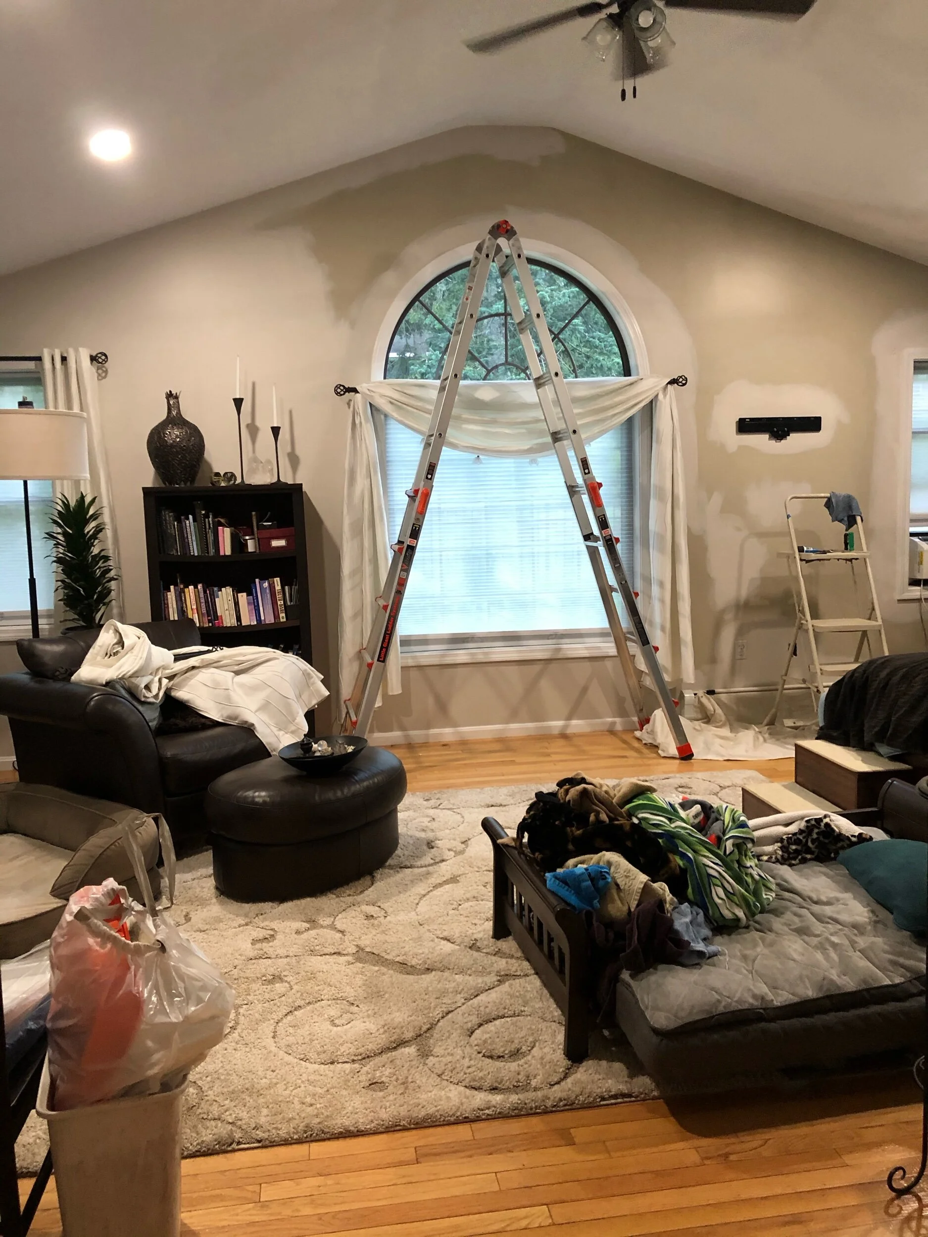 I liked the paint color when I chose it seven years ago, but years of grime on the walls (“ghosting”, and not the social media kind) had lent it a dark and dingy quality. You can see the stripes where the cold air leaking in at the rafters and gaps in insulation created the right conditions for particulates to stick. And then of course the smeared areas where I tried unsuccessfully to wash it.